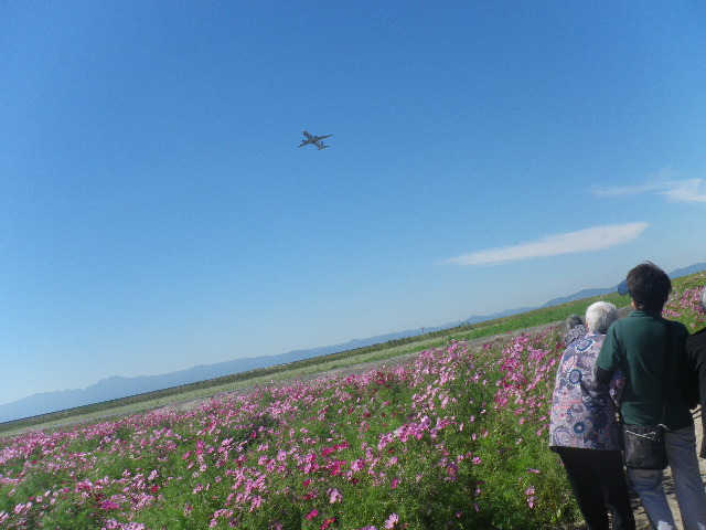 空港そばとあって飛行機が離陸し、私たちがいるコスモス畑の真上を横切って行きました。