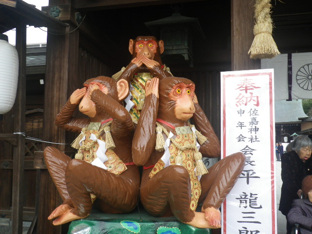 佐嘉神社の鳥居には毎年干支の石造が飾られていますが、今年は申年ということで「見ざる、言わざる。聞かざる」と3匹のかわいらしい申が・・・。