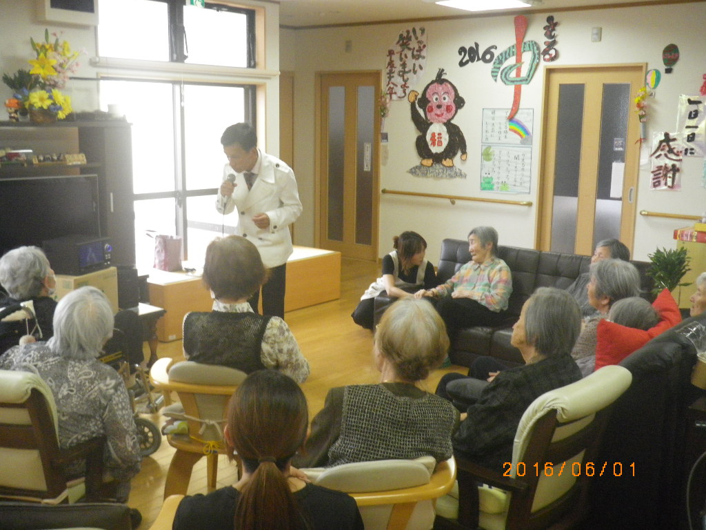 先生が得意とされる「島津 亜矢」の曲目や入居者様方で得意とされている「水森 かおる」の曲目と皆さんからのリクエストのお応えするような形で歌ってくださいました。