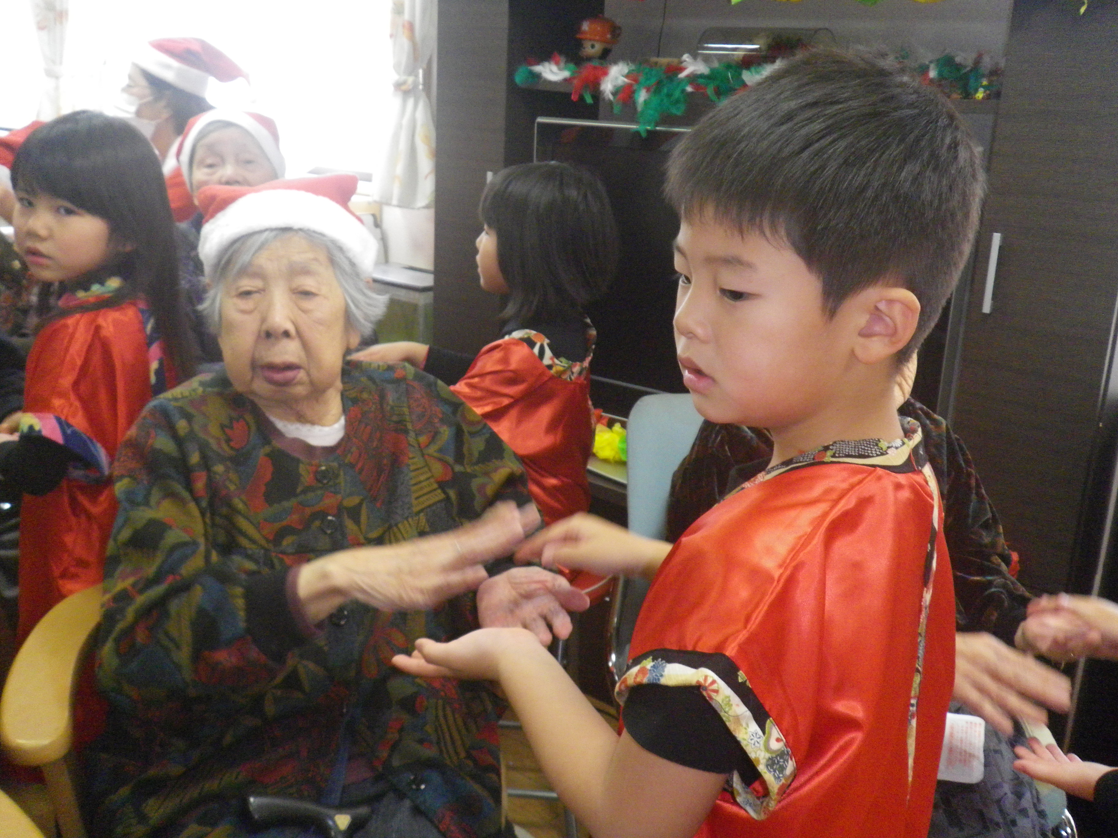 園児の囲まれ、少しタジタジ気味の入居者様もいらっしゃいましたが、目を細めて楽しまれたようです。