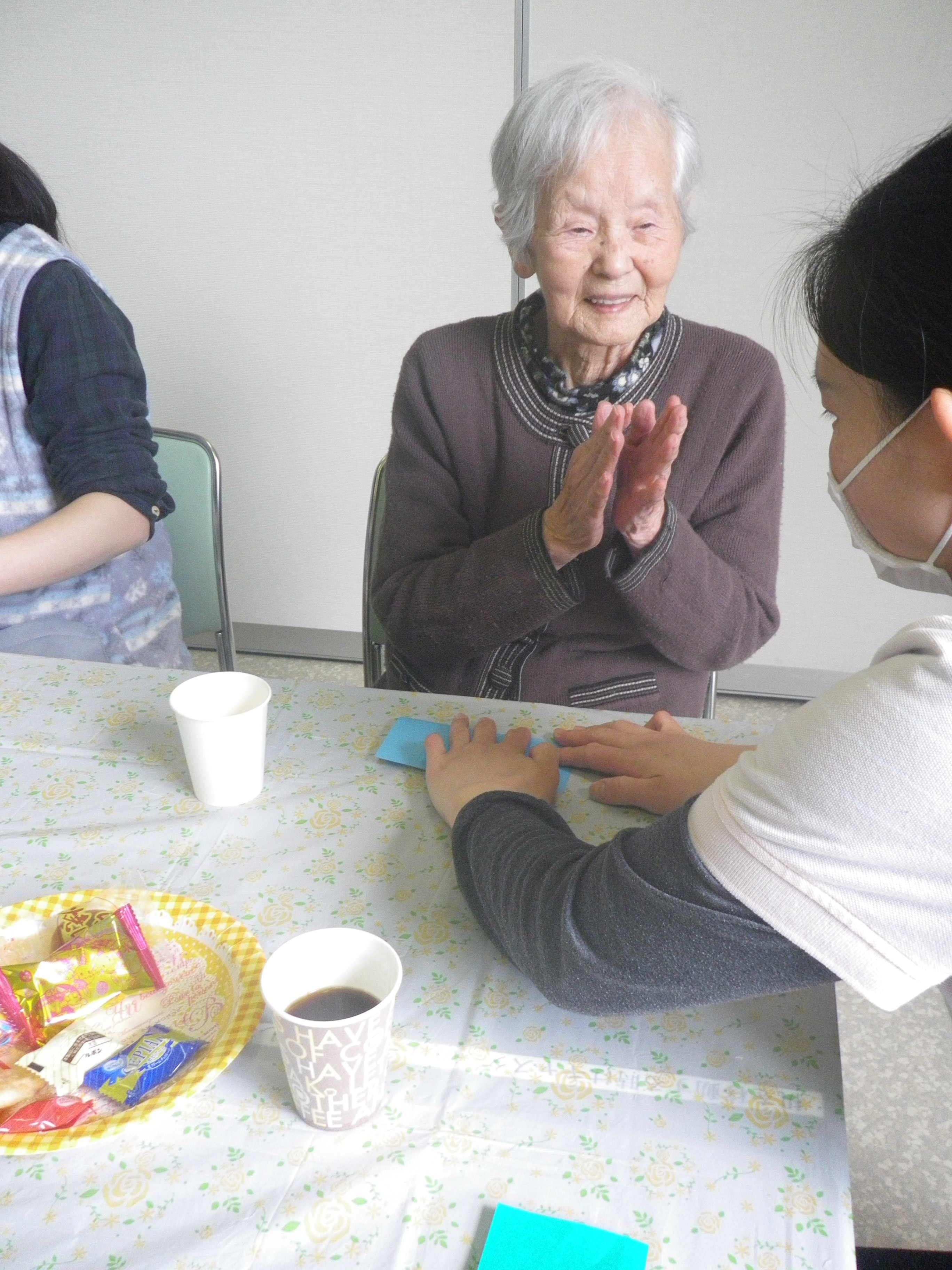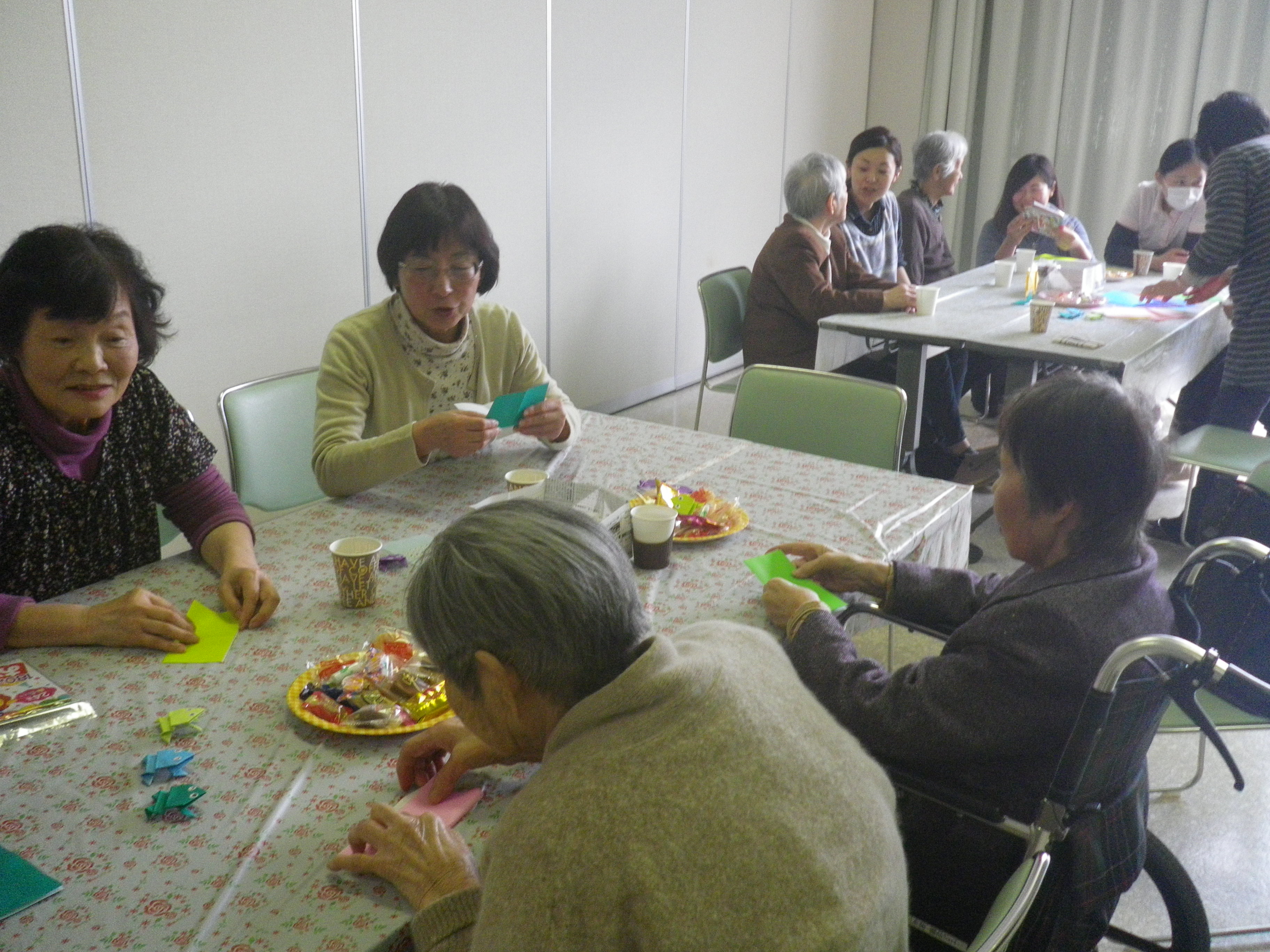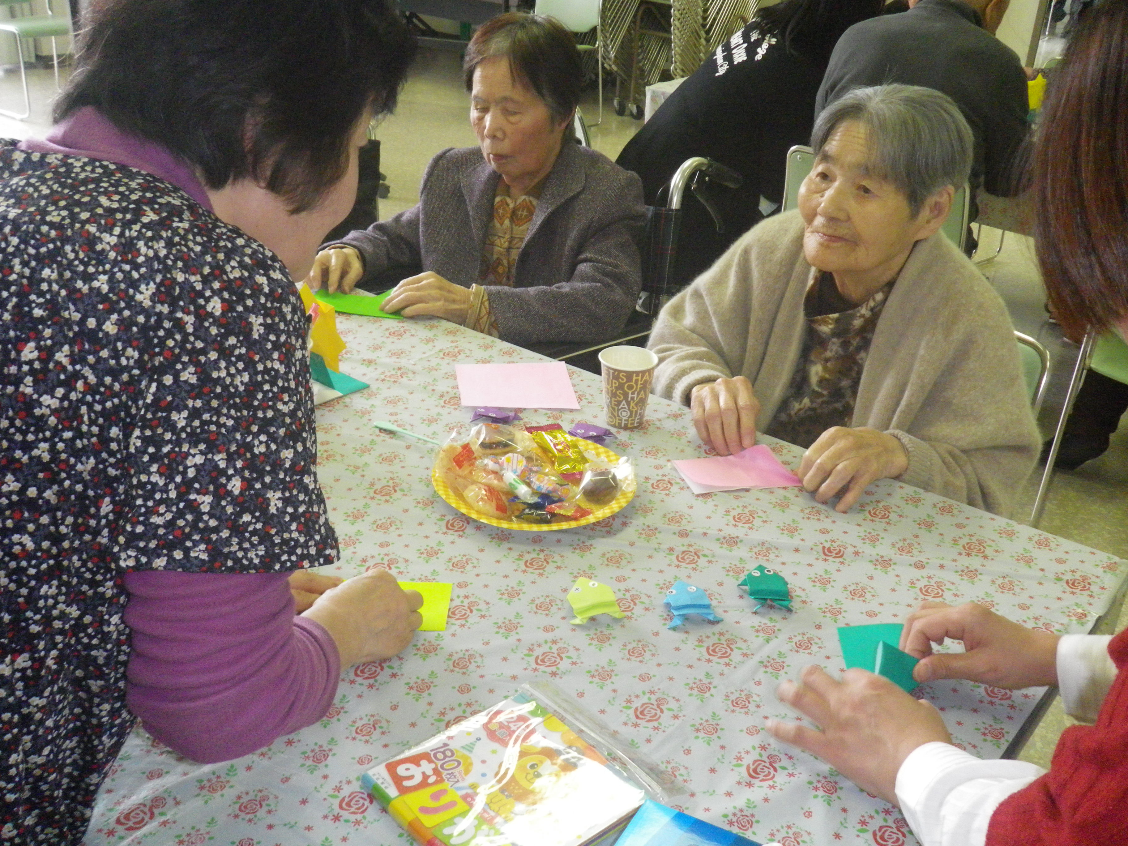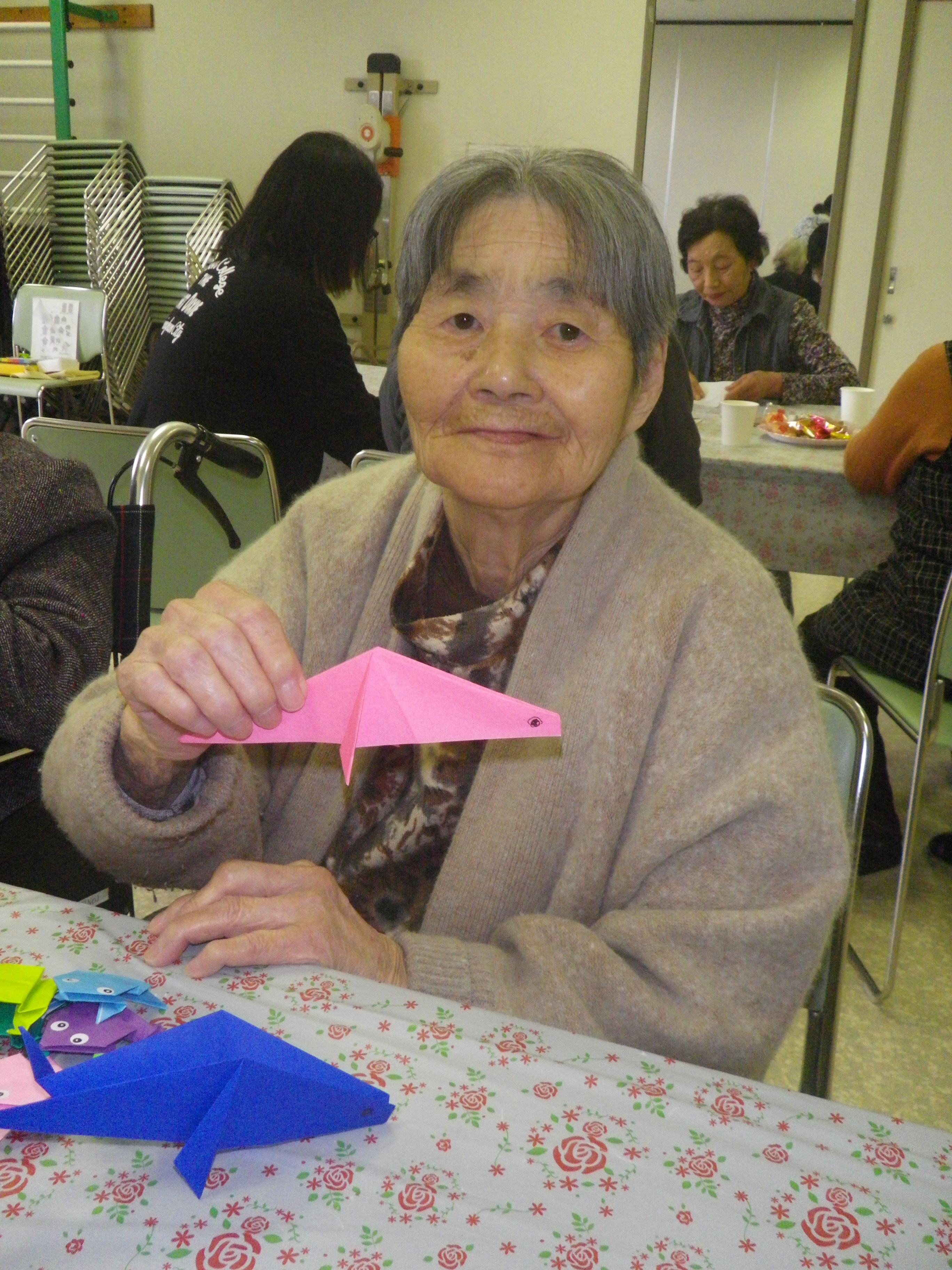 入居者様にとってはかなりの高度な折り紙となりましたが、ボランティアの方が丁寧に教えてくださり、皆さん完成することができました(^◇^)