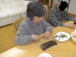 隣接する立野紀水苑でも 恵方巻き作り、豆まきを行っていますが、当苑でも負けないくらいのおいし~い恵方巻きを作りました。