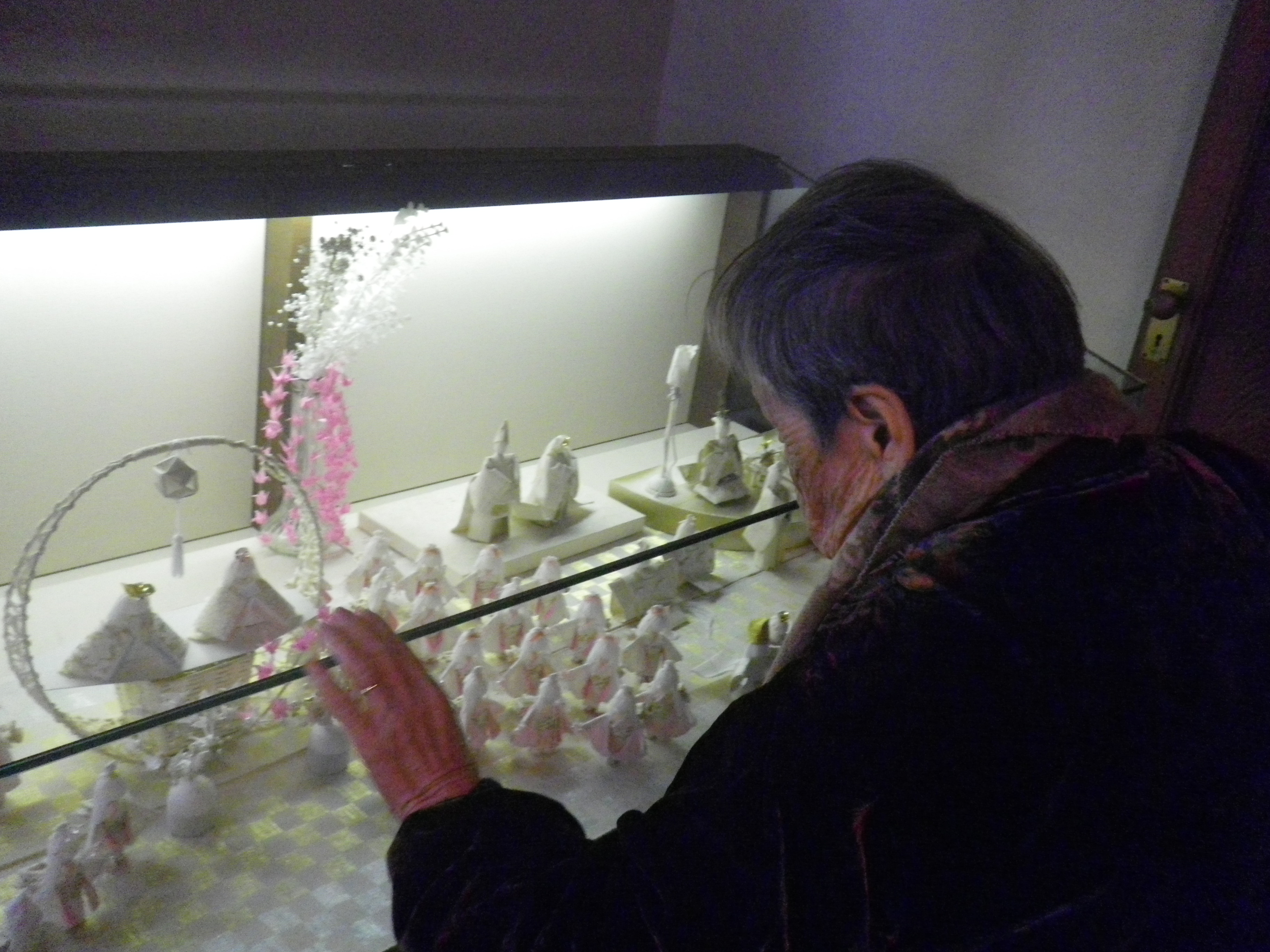 たくさんのお雛様が飾られていましたが、その中でも和紙で作られた雛飾りやケーキや和菓子で作られたお雛様に皆さん魅入られていました 。
