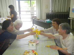 以前にも「よってみゅうかふぇ」の事をご紹介いたしましたが、簡単に説明しますと、認知症の方がいらっしゃるご家族様、またはご当人様が行政機関のおたっしゃ本舗様への相談を兼ねて施設見学もできたり、施設スタッフ、他のご家族様と気軽にお話もできる機会を設けようといった事で始められたようです。当苑の入居者様もお誘いしてもらって毎回参加させてもらっています。もちろん、「かふぇ」ですので、お菓子や飲み物を頂きながら・・・(^o^)丿