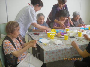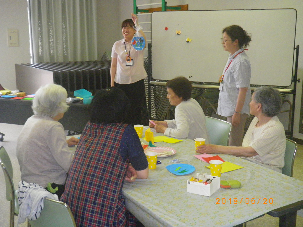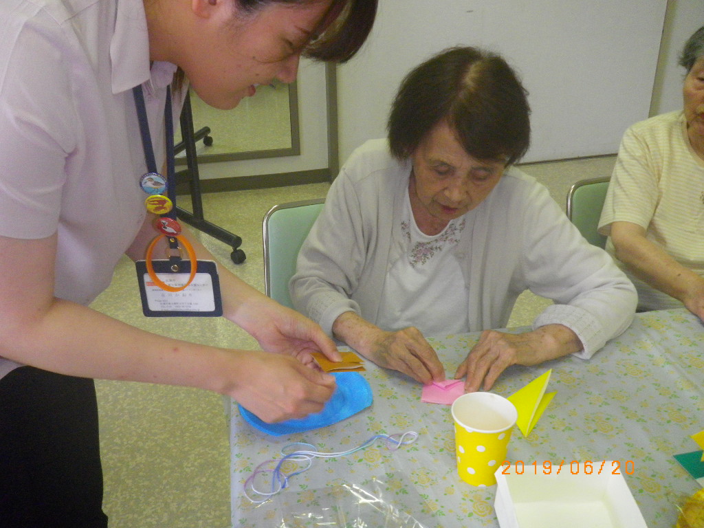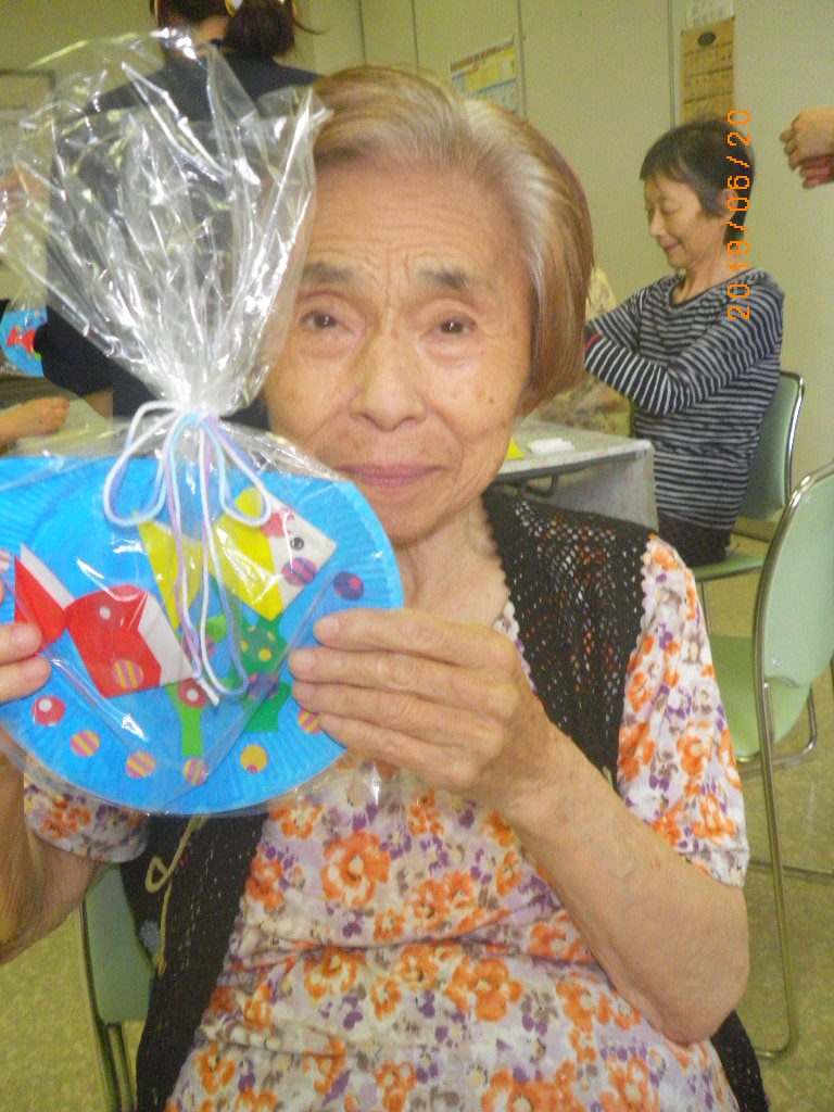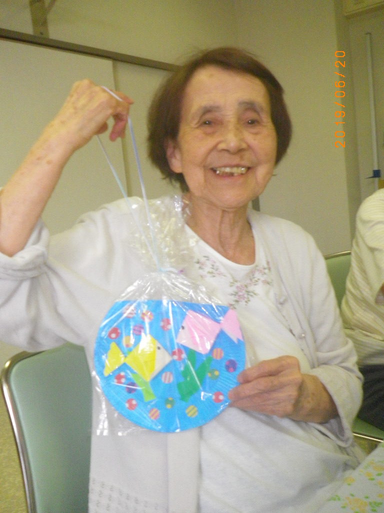 本日は、もうすぐ夏との事で折り紙で金魚を折って壁飾りを作ってきました。金魚の色を尋ねると・・・「黄色かね?ピンクかね?」